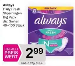 | Always Daily Fresh 54 Stk | PENNY | € 2,99 | 12 Februar 2026 | 19 Februar 2026 | |||