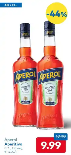 | 2 | Aperol Aperitivo 0,7 l | T&G | € 17,99 | € 9,99 | -44% billiger | 23 April 2026 | 06 Mai 2026 | Angebot ansehen | |