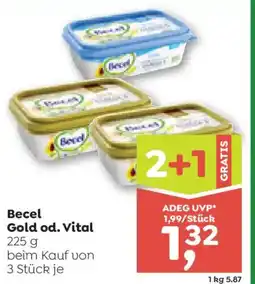 | Becel Gold od. Vital 675 g 2+1 GRATIS | ADEG | € 1,32 | 2+1 GRATIS | 11 Dezember 2025 | 17 Dezember 2025 | ||