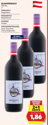 | Blaufränkisch 1 l 2+1 GRATIS | Hofer | € 2,79 | € 1,86 | 2+1 GRATIS | 02 Jänner 2026 | 09 Jänner 2026 | |
