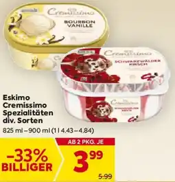 | Eskimo cremissimo spezialitäten div. sorten 825 ml/ 900 ml | Billa | € 5,99 | € 3,99 | -33% BILLIGER | 18 September 2025 | 24 September 2025 | |