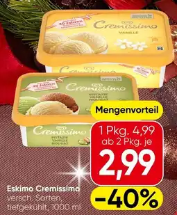 | Eskimo Cremissimo Eis 1000 ml | Spar | € 2,99 | 21 März 2024 | 03 April 2024 | |||
