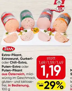 | TANN Extra-Pikant, Extrawurst, Gurkerl- oder Chili-Extra, Puten-Extra oder Puten-Pikant SPAR 100 Gramm | Spar | € 1,59 | € 1,19 | € 0,40 Rabatt | 14 August 2024 | 21 August 2024 | |