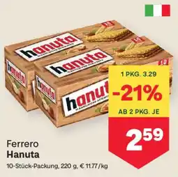 | 2 | Ferrero Hanuta 220 g | MPreis | € 3,28 | € 2,59 | -21% | 05 März 2026 | 11 März 2026 | Angebot ansehen | |