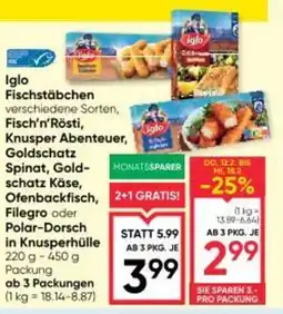 | 10 | Iglo fisch-, brezel- oder back- fischstäbchen, fisch'n'rösti, goldschatz oder polar-dorsch in knusperhülle, msc 300 g - 450 g | Sutterlüty | € 3,99 | 12 Februar 2026 | 18 Februar 2026 | Angebot ansehen |