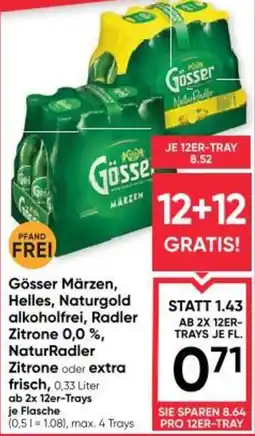 | Gösser Märzen, Helles, NaturRadler Zitrone oder Zitrus Mix extra frisch, Radler 0,0% oder Naturgold alkoholfrei 0.33 l 12+12 GRATIS | Maximarkt | € 1,33 | € 0,66 | 12+12 GRATIS | 26 August 2024 | 31 August 2024 | |