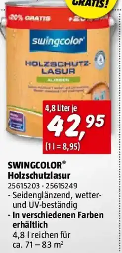 | Swingcolor holzlasur 4.8 L | Bauhaus | € 42,95 | 01 April 2026 | 21 April 2026 | |||