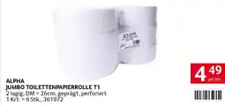 | Alpha jumbo toilettenpapierrolle t1 | Transgourmet | € 3,99 | 17 November 2025 | 22 November 2025 | |||