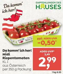 | M Midi Rispentomaten MPREIS 400 g | MPreis | € 3,49 | € 2,00 | -43% billiger | 15 Jänner 2026 | 17 Jänner 2026 | |