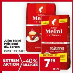 | Julius meinl präsident div. sorten billa 500 gramm 1 packung | Billa | € 10,99 | € 5,49 | € 5,50 Rabatt | 07 Dezember 2023 | 13 Dezember 2023 | |