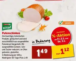 | 3 | Spar Vital Putenschinken 0.1 kg | Eurospar | € 2,09 | € 1,49 | € 0,60 Rabatt | 02 Jänner 2026 | 14 Jänner 2026 | Angebot ansehen | |