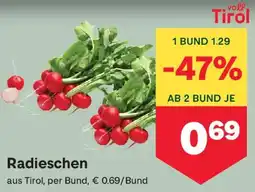 | 7 | Radieschen MPREIS 1 Bd. | MPreis | € 1,29 | € 0,69 | -47% billiger | 02 April 2026 | 22 April 2026 | Angebot ansehen | |