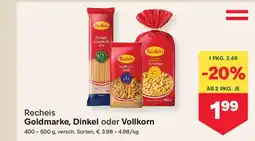 | Recheis Dinkel Pasta verschiedene Sorten MPREIS 400 Gramm 1 Packung | MPreis | € 2,49 | € 1,99 | € 0,50 Rabatt | 06 Mai 2024 | 12 Mai 2024 | |