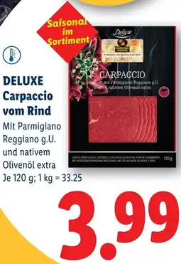 | Deluxe Carpaccio vom Rind Lidl 120 Gramm 1 Packung | Lidl | € 3,99 | 14 März 2024 | 20 März 2024 | |||