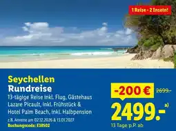 | 1 | Seychellen Rundreise | Lidl Reisen | € 2.699,00 | € 2.499,00 | € 200,00 Rabatt | 08 April 2026 | 13 Mai 2026 | Angebot ansehen | |