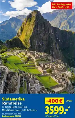 | 2 | Südamerika Rundreise | Lidl Reisen | € 3.999,00 | € 3.599,00 | € 400,00 Rabatt | 08 April 2026 | 13 Mai 2026 | Angebot ansehen | |