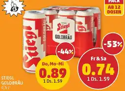 | STIEGL GOLDBRÄU pro 0,5 Liter Dose | PENNY | € 1,39 | € 0,89 | € 0,50 Rabatt | 19 Oktober 2023 | 24 Oktober 2023 |