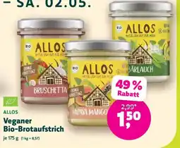 | ALLOS Veganer Bio-Brotaufstrich 1400 g/175 g | Denn's Biomarkt | € 2,99 | € 2,29 | € 0,70 Rabatt | 02 Juli 2025 | 15 Juli 2025 | |
