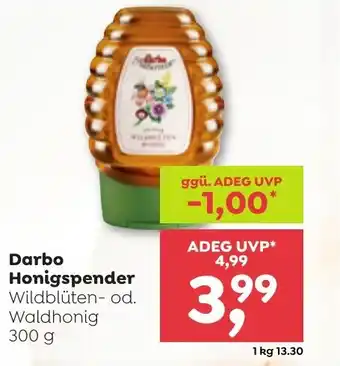 Den Preis von Darbo Honigspender finden Sie oben auf der Website, zusammen mit dem Datum, ab wann das Angebot erhältlich ist. Sie finden die Preise auch im aktuellen ADEG Flugblatt oder auf der ADEG Website. Durch die Angebote aus dem Flugblatt können Sie sicher sein, die ADEG Produkte zum garantiert besten Preis zu ergattern.