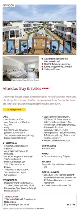 Den Preis von Afandou Bay & Suites finden Sie oben auf der Website, zusammen mit dem Datum, ab wann das Angebot erhältlich ist. Sie finden die Preise auch im aktuellen Billa Reisen Flugblatt oder auf der Billa Reisen Website. Durch die Angebote aus dem Flugblatt können Sie sicher sein, die Billa Reisen Produkte zum garantiert besten Preis zu ergattern.