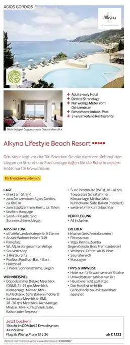Den Preis von Alkyna Lifestyle Beach Resort finden Sie oben auf der Website, zusammen mit dem Datum, ab wann das Angebot erhältlich ist. Sie finden die Preise auch im aktuellen Billa Reisen Flugblatt oder auf der Billa Reisen Website. Durch die Angebote aus dem Flugblatt können Sie sicher sein, die Billa Reisen Produkte zum garantiert besten Preis zu ergattern.