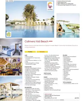 Den Preis von Calimera Yati Beach finden Sie oben auf der Website, zusammen mit dem Datum, ab wann das Angebot erhältlich ist. Sie finden die Preise auch im aktuellen Billa Reisen Flugblatt oder auf der Billa Reisen Website. Durch die Angebote aus dem Flugblatt können Sie sicher sein, die Billa Reisen Produkte zum garantiert besten Preis zu ergattern.