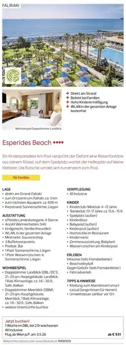 Den Preis von Esperides Beach finden Sie oben auf der Website, zusammen mit dem Datum, ab wann das Angebot erhältlich ist. Sie finden die Preise auch im aktuellen Billa Reisen Flugblatt oder auf der Billa Reisen Website. Durch die Angebote aus dem Flugblatt können Sie sicher sein, die Billa Reisen Produkte zum garantiert besten Preis zu ergattern.