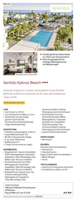 Den Preis von Sentido Kyknos Beach finden Sie oben auf der Website, zusammen mit dem Datum, ab wann das Angebot erhältlich ist. Sie finden die Preise auch im aktuellen Billa Reisen Flugblatt oder auf der Billa Reisen Website. Durch die Angebote aus dem Flugblatt können Sie sicher sein, die Billa Reisen Produkte zum garantiert besten Preis zu ergattern.