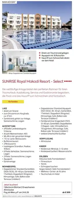 Den Preis von SUNRISE Royal Makadi Resort - Select finden Sie oben auf der Website, zusammen mit dem Datum, ab wann das Angebot erhältlich ist. Sie finden die Preise auch im aktuellen Billa Reisen Flugblatt oder auf der Billa Reisen Website. Durch die Angebote aus dem Flugblatt können Sie sicher sein, die Billa Reisen Produkte zum garantiert besten Preis zu ergattern.
