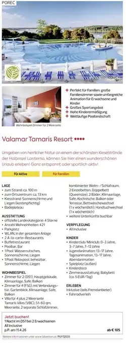 Den Preis von Valamar Tamaris Resort finden Sie oben auf der Website, zusammen mit dem Datum, ab wann das Angebot erhältlich ist. Sie finden die Preise auch im aktuellen Billa Reisen Flugblatt oder auf der Billa Reisen Website. Durch die Angebote aus dem Flugblatt können Sie sicher sein, die Billa Reisen Produkte zum garantiert besten Preis zu ergattern.