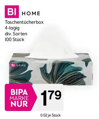 Den Preis von Taschentücherbox finden Sie oben auf der Website, zusammen mit dem Datum, ab wann das Angebot erhältlich ist. Sie finden die Preise auch im aktuellen Bipa Flugblatt oder auf der Bipa Website. Durch die Angebote aus dem Flugblatt können Sie sicher sein, die Bipa Produkte zum garantiert besten Preis zu ergattern.