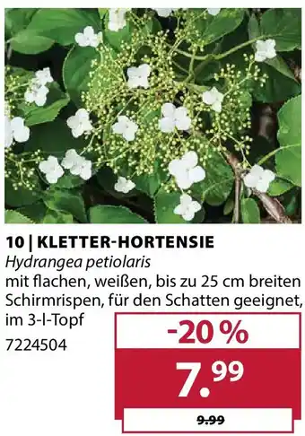 Das Angebot finden Sie in unterschiedlichen Geschäften. Schauen Sie sich alle Produkte aus dem Flugblatt an, um das günstigste Kletter-hortensie hydrangea petiolaris zu ergattern. Wenn Sie gerne nachschauen möchten, ob der Artikel woanders noch günstiger ist, sollten Sie sich die Kategorie 'Garten' anschauen. Möglicherweise sind diese Flugblattangebote auch interessant für Sie: Dehner Kletter-Hortensie, Hortensie & Rispen-hortensie.