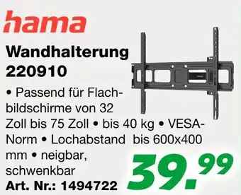 Das Angebot finden Sie in unterschiedlichen Geschäften. Schauen Sie sich alle Produkte aus dem Flugblatt an, um das günstigste Wandhalterung 220910 zu ergattern. Wenn Sie gerne nachschauen möchten, ob der Artikel woanders noch günstiger ist, sollten Sie sich die Kategorie 'Elektronik' anschauen. Möglicherweise sind diese Flugblattangebote auch interessant für Sie: Wandhalterung tvm 5505, Art.Nr. 80250 Wandhalterung & Wandhalterungs-set.