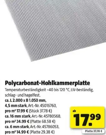Das Angebot finden Sie in unterschiedlichen Geschäften. Schauen Sie sich alle Produkte aus dem Flugblatt an, um das günstigste Polycarbonat Hohlkammerplatte zu ergattern. Wenn Sie gerne nachschauen möchten, ob der Artikel woanders noch günstiger ist, sollten Sie sich die Kategorie 'Möbel und Garten' anschauen. Möglicherweise sind diese Flugblattangebote auch interessant für Sie: Polycarbonat hohlkammerplatte, Gutta Polycarbonat-Hohlkammerplatte & Hohlkammerplatte.