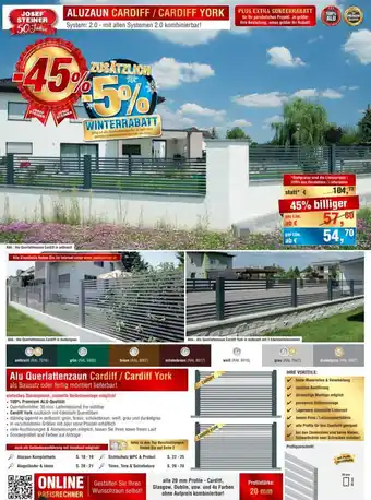 Den Preis von Alu Querlattenzaun Cardiff / Cardiff York finden Sie oben auf der Website, zusammen mit dem Datum, ab wann das Angebot erhältlich ist. Sie finden die Preise auch im aktuellen Josef Steiner Flugblatt oder auf der Josef Steiner Website. Durch die Angebote aus dem Flugblatt können Sie sicher sein, die Josef Steiner Produkte zum garantiert besten Preis zu ergattern.