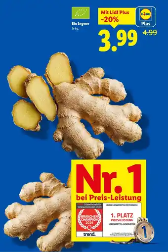 Den Preis von Bio Ingwer finden Sie oben auf der Website, zusammen mit dem Datum, ab wann das Angebot erhältlich ist. Sie finden die Preise auch im aktuellen Lidl Flugblatt oder auf der Lidl Website. Durch die Angebote aus dem Flugblatt können Sie sicher sein, die Lidl Produkte zum garantiert besten Preis zu ergattern.