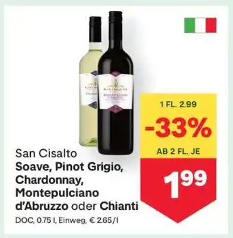 Das Angebot finden Sie in unterschiedlichen Geschäften. Schauen Sie sich alle Produkte aus dem Flugblatt an, um das günstigste San Cisalto zu ergattern. Wenn Sie gerne nachschauen möchten, ob der Artikel woanders noch günstiger ist, sollten Sie sich die Kategorie 'Supermärkte' anschauen. Möglicherweise sind diese Flugblattangebote auch interessant für Sie: San Cisalto Wein, San Cisalto Wein & San Cisalto Pinot Grigio.