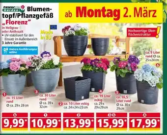 Jetzt im Angebot bei Norma: Blumentopf/Pflanzgefäß „Florenz“ ✅ Aktion gültig von 2-03 bis 7-03.