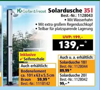 Das Angebot finden Sie in unterschiedlichen Geschäften. Schauen Sie sich alle Produkte aus dem Flugblatt an, um das günstigste Solardusche zu ergattern. Wenn Sie gerne nachschauen möchten, ob der Artikel woanders noch günstiger ist, sollten Sie sich die Kategorie 'Supermärkte' anschauen. Möglicherweise sind diese Flugblattangebote auch interessant für Sie: Solardusche 35 l, Steinbach Solardusche Flexible & Steinbach Solardusche Classic.