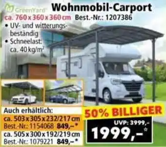 Das Angebot finden Sie in unterschiedlichen Geschäften. Schauen Sie sich alle Produkte aus dem Flugblatt an, um das günstigste Wohnmobil-Carport zu ergattern. Wenn Sie gerne nachschauen möchten, ob der Artikel woanders noch günstiger ist, sollten Sie sich die Kategorie 'Supermärkte' anschauen. Möglicherweise sind diese Flugblattangebote auch interessant für Sie: Abenteuer Wohnmobil, Carport saint- tropez & Carport saint tropez.