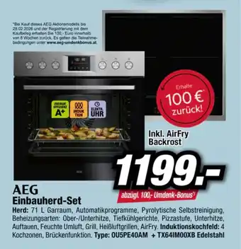 Das Angebot finden Sie in unterschiedlichen Geschäften. Schauen Sie sich alle Produkte aus dem Flugblatt an, um das günstigste Einbauherd-Set zu ergattern. Wenn Sie gerne nachschauen möchten, ob der Artikel woanders noch günstiger ist, sollten Sie sich die Kategorie 'Elektronik' anschauen. Möglicherweise sind diese Flugblattangebote auch interessant für Sie: AEG Einbauherd-Set mit Induktionskochfeld, AEG Einbauherd-Set & AEG Einbauherd-Set OU5PE40AM + TX64IM00XB.
