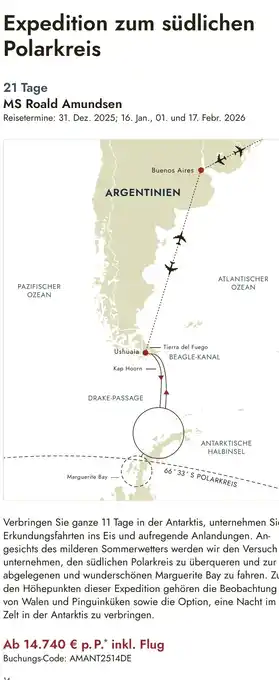 Das Angebot finden Sie in unterschiedlichen Geschäften. Schauen Sie sich alle Produkte aus dem Flugblatt an, um das günstigste Expedition zum südlichen Polarkreis zu ergattern. Wenn Sie gerne nachschauen möchten, ob der Artikel woanders noch günstiger ist, sollten Sie sich die Kategorie 'Reisen und Urlaub' anschauen. Möglicherweise sind diese Flugblattangebote auch interessant für Sie: Die Expedition zur Gürteltiermine, Die ultimativ expedition - fjorde und nationalparks & Expedition rund um Spitzbergen.