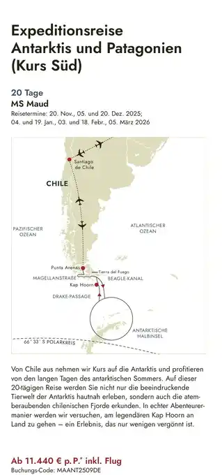 Expeditionsreise Antarktis und Patagonien (Kurs Süd) ist jetzt bei ruefa im Angebot. Alle Informationen zu Preisen, Laufzeit und Aktionsbedingungen findest du hier. Du kannst Expeditionsreise Antarktis und Patagonien (Kurs Süd) direkt online auf der Website von ruefa bestellen oder es zum besten Preis im Geschäft kaufen. Wir zeigen dir stets die besten Expeditionsreise Antarktis und Patagonien (Kurs Süd) Angebote. Wenn du als Erste informiert werden möchtest, aktiviere die Benachrichtigung per Glockensymbol, sobald Expeditionsreise Antarktis und Patagonien (Kurs Süd) wieder reduziert ist.Häufig gestellte Fragen über Expeditionsreise Antarktis und Patagonien (Kurs Süd)