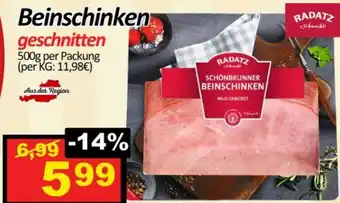 Das Angebot finden Sie in unterschiedlichen Geschäften. Schauen Sie sich alle Produkte aus dem Flugblatt an, um das günstigste Beinschinken zu ergattern. Wenn Sie gerne nachschauen möchten, ob der Artikel woanders noch günstiger ist, sollten Sie sich die Kategorie 'Supermärkte' anschauen. Möglicherweise sind diese Flugblattangebote auch interessant für Sie: Beinschinken, Radatz Beinschinken & Beinschinken Kesselfrisch SPAR Gourmet.