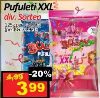Den Preis von Pufuleti XXL finden Sie oben auf der Website, zusammen mit dem Datum, ab wann das Angebot erhältlich ist. Sie finden die Preise auch im aktuellen Wurstico Flugblatt oder auf der Wurstico Website. Durch die Angebote aus dem Flugblatt können Sie sicher sein, die Wurstico Produkte zum garantiert besten Preis zu ergattern.